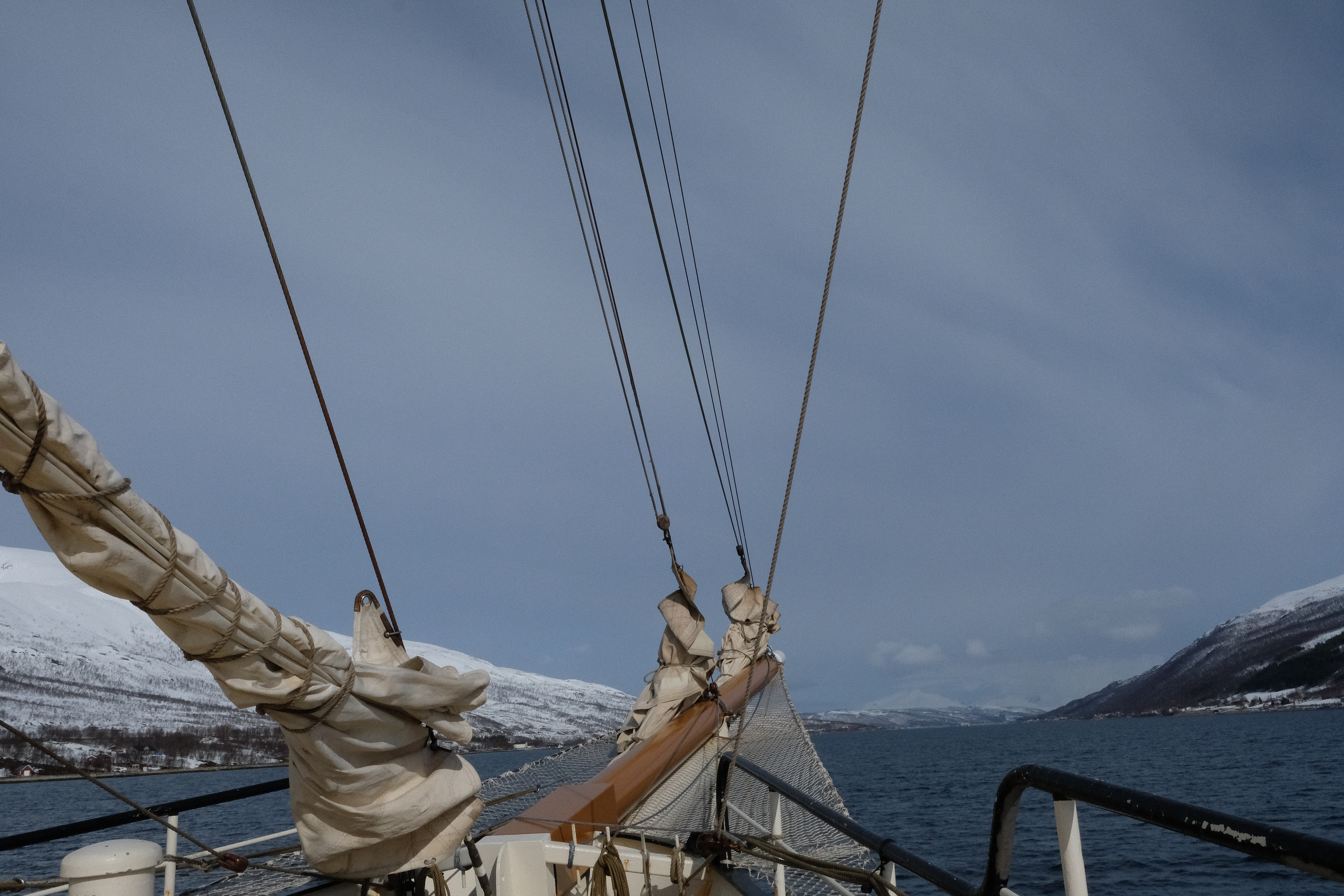 Je monte sur le mat, dans les fjords avant l’arrivée à Tromsø.