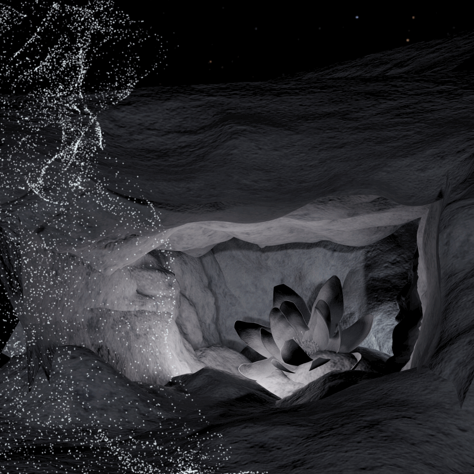 A cave made of ice, the world is so dark that ice turns ashes, the ruin of a lotus, particles of thoughts from day16 -the past-, a witch calling my name, again and again. 3D-transformation of a vision - visualisation ***//*°_/// blossom will come, TRUST.