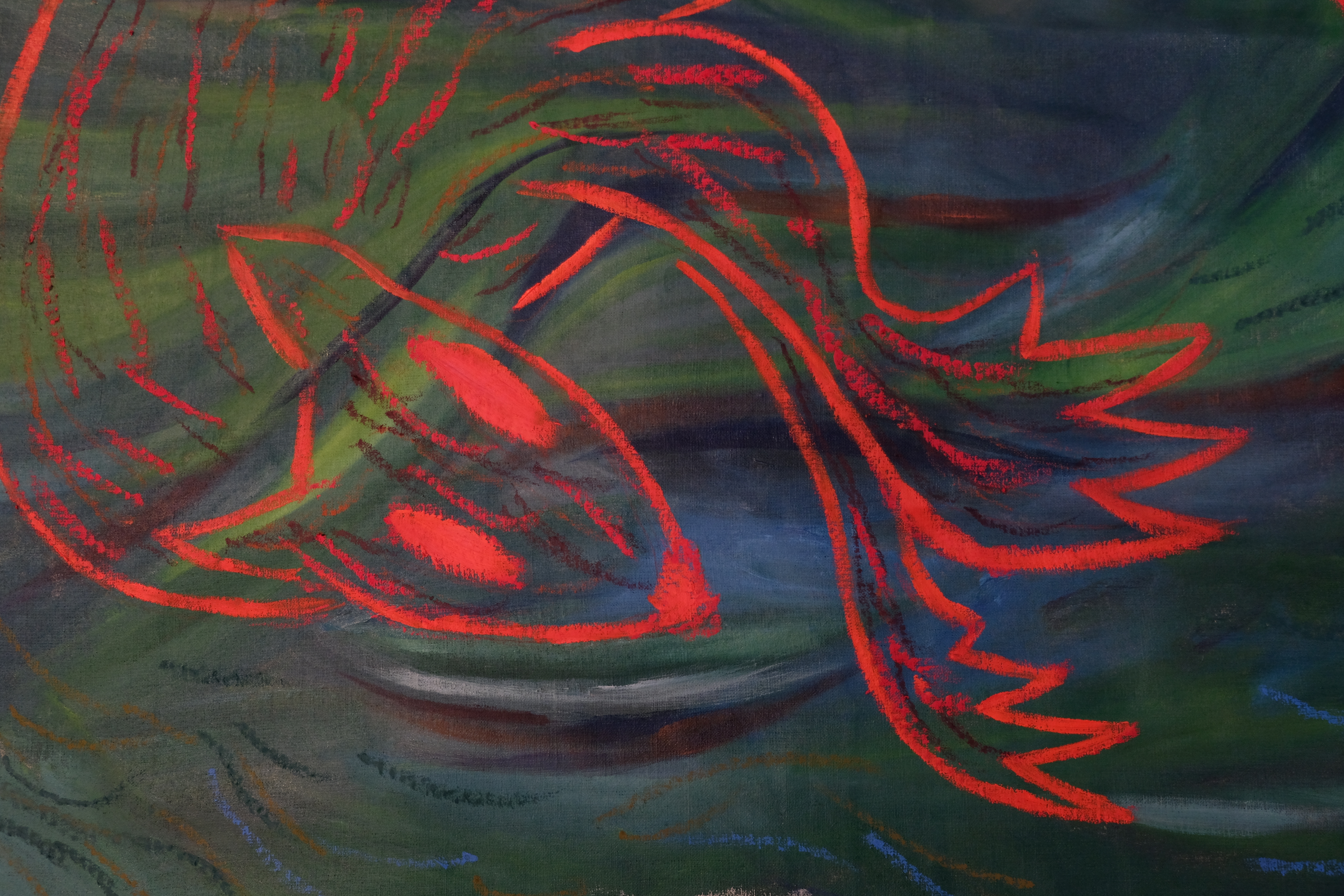 The triptych includes three oil paintings and oil pastels on raw linen without wood frame. Each painting is 1 metre wide and 1.5 metres long (height). The central painting represents the tower collapsing in the fire. At its centre, in the vertical, we can identify a white slit (made with oil pastel, canvas without holes). In the chaos of the burning tower, the white crack represents the space of possibilities in the moment of transition. It is the space of a possible, even necessary, regeneration in the brutality of a breathless system that is collapsing in on itself, on its ruins. To the right and left are the two canvases representing the spaces of regeneration in the moment of chaos, which emerge from the white crack: animals, spirits and human forms are the central figures of this space. It is a presence that emanates, that drifts. A presence that emerges from the human monologue and its ego, a presence that thinks of the companionship of species, the end of accumulation, the end of exploitation, the experience of ecological finitude: regeneration. The green vegetations are the common space of these presences, somewhere between abstract and figurative, they are moving, verdant, alive, as if blown in the wind.